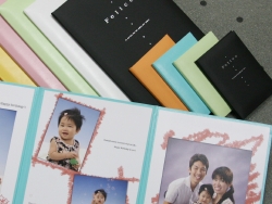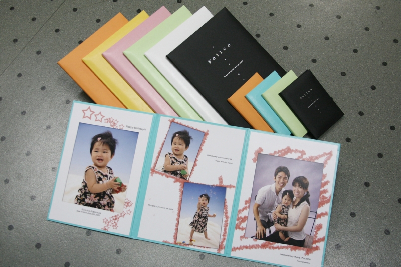 フェリーチェ1冊税込 38,830円 3面のデザインアルバムですが価格がとてもリーズナブルです。7色ご用意しています。かばんの中に入るミニチュア版もご用意。写真は大2、小2カットの計4カットの構成です。お子様の誕生日、撮影日が入ります。ご希望のメッセージも加えることもできます。 |