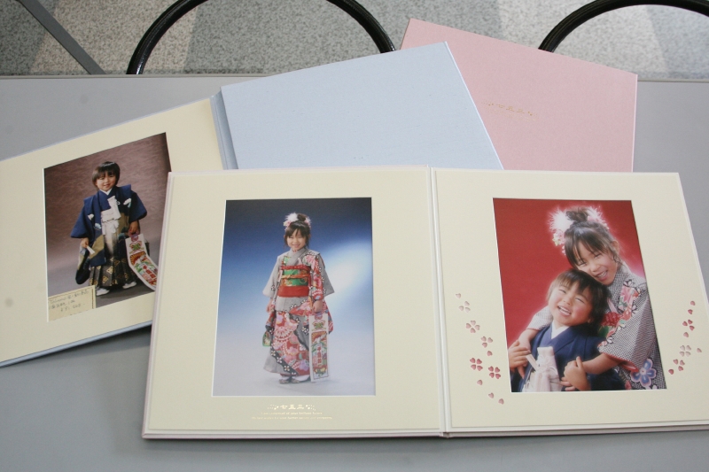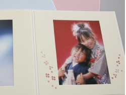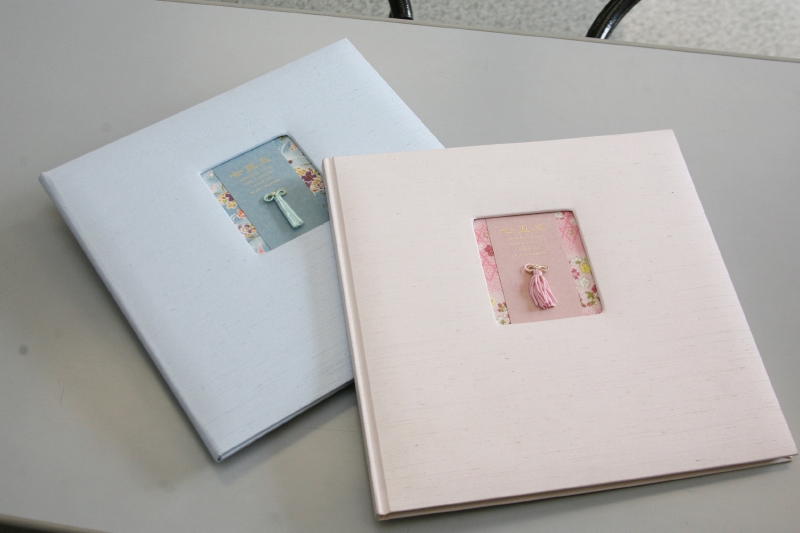六切2P+K2P 1冊税込 38,830円 昔ながらの中枠付きの台紙です。表紙、中枠のデザインがとてもかわいく人気のアルバムです。男の子はブルー、女の子はピンクをご用意しています。 |