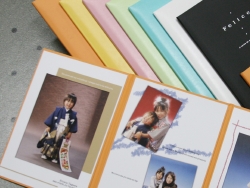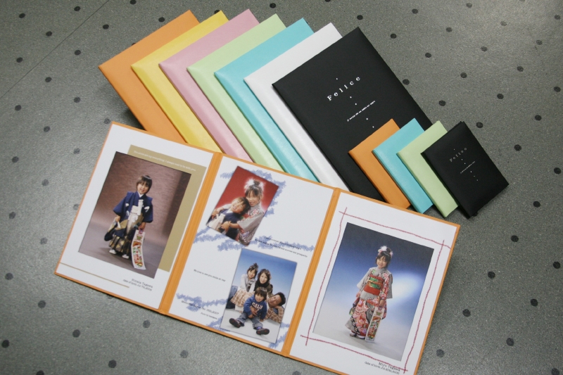 フェリーチェ1冊税込 38,830円 3面のデザインアルバムですが価格がとてもリーズナブルです。7色ご用意しています。かばんの中に入るミニチュア版もご用意。写真は大2、小2カットの計4カットの構成です。お子様の誕生日、撮影日が入ります。ご希望のメッセージも加えることもできます。 |